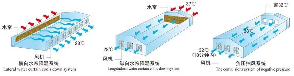 พัดลมดูดอากาศและแผ่นทำความเย็นจะถูกติดตั้งที่ผนังฝั่งตรงข้าม แรงดันลบขนาดใหญ่ อากาศร้อนจะถูกดึงออกนอกโรงเรือน/ฟาร์มสัตว์ปีก แผ่นทำความเย็นจะระเหย และอากาศเย็นจะเข้ามามากขึ้นเรื่อยๆ จึงจะมีฟังก์ชั่นการทำความเย็นที่ดีขึ้น